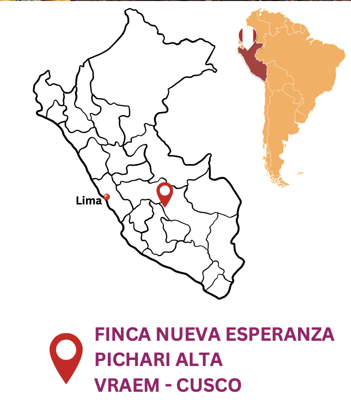 Der Kakao stammt von der familiengeführten, ökologischen Finca „Nueva Esperanza“, wo er im Schatten großer Urwaldbäume wächst. Dieses natürliche Umfeld schützt die Pflanzen und ermöglicht die Entwicklung eines besonders feinen und komplexen Aromaprofils – geprägt von der außergewöhnlichen Biodiversität Perus.