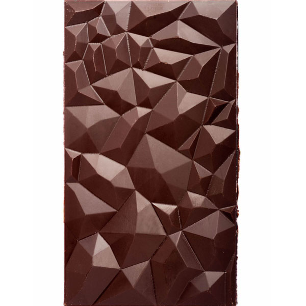 Dunkle Tafel mit 100% Kakaogehalt mit Aromen von mit intensiven Noten von Nüssen, Rosinen und getrockneten Feigen. Es wird keine zusätzliche Kakaobutter hinzugefügt. sie zeigt eine ziemlich hohe Säure, die durch getrockneten Fruchtnoten im Kakao ausgeglichen wird.