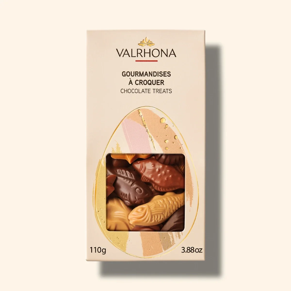 Die VALRHONA »Gourmandises à Croquer« Schokoladenfische sind Teil der Valrhona 2026 Kollektion, einer Reihe feinster Schokoladenkreationen aus Frankreich, die Qualität und Genuss in den Vordergrund stellt. Die Schokolade wird in Frankreich gefertigt – dem Heimatland von Valrhona, das seit 1922 als Referenz für Premium-Schokolade gilt und durch Auswahl erstklassiger Kakaobohnen, traditionelle Handwerkskunst und innovative Technik weltweite Bekanntheit erlangt hat.