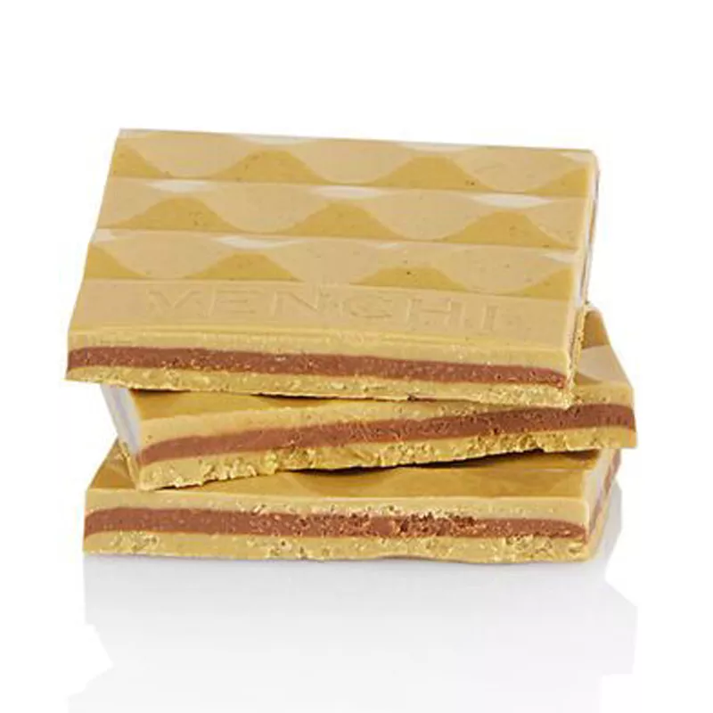 Weiche Cremino-Tafel mit drei Lagen Pistazienpaste: Zwei Lagen Milchschokolade umschließen ein Herz aus weißer Schokolade.